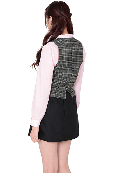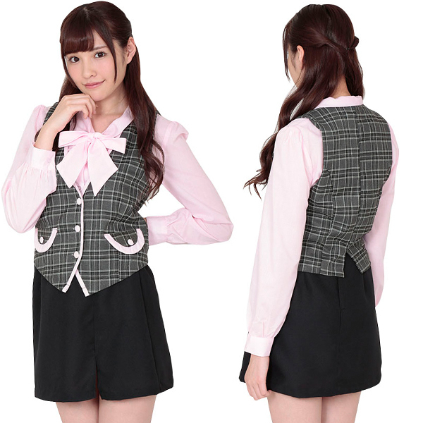 タイトスカートはスリット入りでセクシーに!グレーのチェックベストには、長袖ブラウスのカラーにあわせたパイピングを施しました!フェミニンなオーラを放つOLコスチュームです。