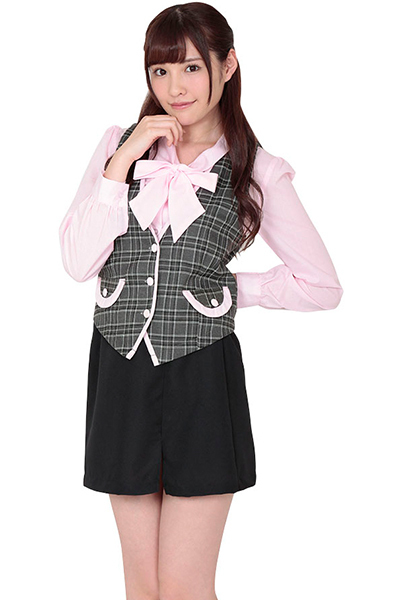 存在感のあるピンクのボウタイブラウスがキュート!モテかわ系のOLコスプレ衣装。