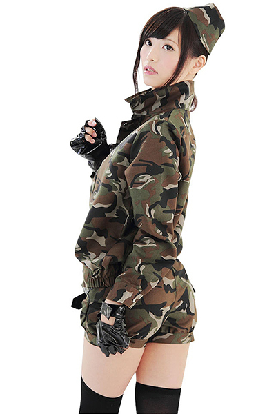 長袖ブルゾン&膝上パンツに、幅広ベルトをキュッと締めれば、ワイルドでセクシーな女兵士が完成!キャップと指無しグローブ付きのお得なコスプレ衣装です。