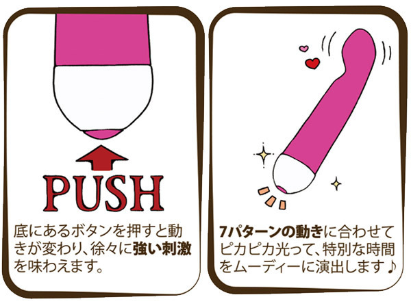 ●マットな質感で心地よい肌触り●丸い先端はプニっと柔らか●扱いやすく手にフィット●リズミカルな7パターン振動搭載●底部ボタンを押す度に振動が変化●振動と連動して持ち手が点灯●お手入れ簡単な生活防水仕様。