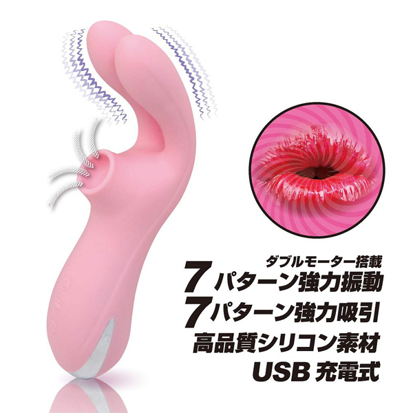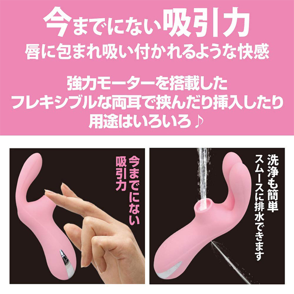 強力モーターを搭載した、フレキシブルな両耳で「挟んだり」「挿入したり」用途はいろいろ♪●7パターン振動●7パターン吸引●高品質シリコン素材●生活防水●静音設計●専用USB充電コード付属、充電時間:60分、 連続稼働時間:40分