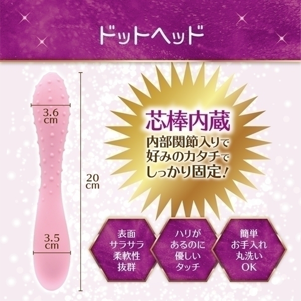 自分好みに調整できるフレキシブルなスティックタイプの商品です♪内部には関節構造が搭載されており、自由に曲げて形を調整することが可能!本体は全長20cmで、異なるサイズの2つのヘッドを採用しています♪3.6cmのヘッドには無数のドットが施されており、工夫されたデザインが楽しさを引き立てます!曲げた形をそのままキープできる構造なので、さまざまなシーンでお使いいただけます♪使用後は水で丸洗いし、しっかり乾燥させてから保管してください!高品質なシリコン素材で耐久性に優れ、使いやすさも抜群♪ぜひ、この多機能なアイテムで新しい体験をお楽しみください!