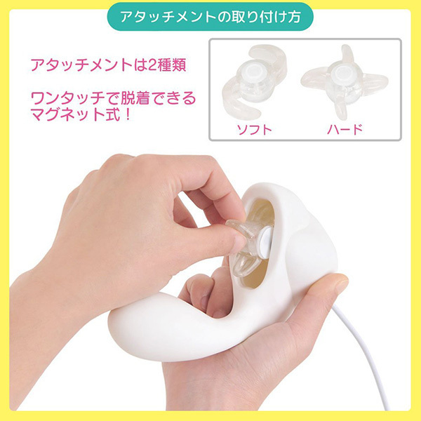 舌型アタッチメントはワンタッチで脱着できるほか、ソフトでやさしい肌触りなのもポイントです♪舌パーツは丸洗いもできるので衛生面の心配もなく、振動強度や回転速度が7段階も調節可能なのもウレシイところ。