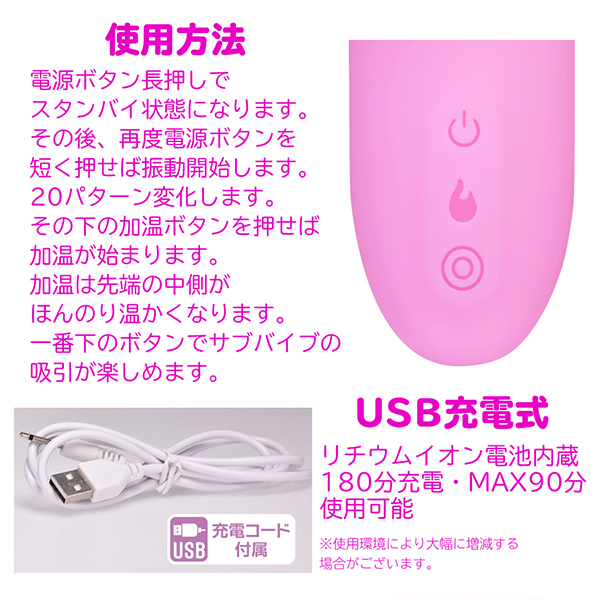 もうセックスしなくて良い気持ち良さ!中イキした事ない人にもおススメ!滑らかな触り心地と柔らかさの高品質シリコンボディにUSB充電式リチウムイオン電池による絶妙振動アクションとサブバイブによる吸引機能、さらに先端部の加温機能まで搭載した高性能バイブ。