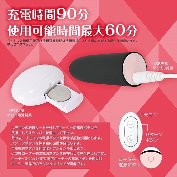 パッケージ:11.5×9.0×3.0cm 本体:ローター7.4×2.2cm・リモコン5.4×3.2×1.8cm 重量:36g USB充電式