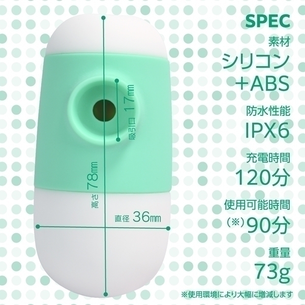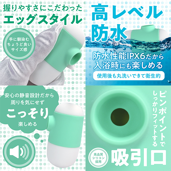 握りやすさにこだわったエッグスタイル吸引ローターです♪可愛らしいデザインに、静音設計の高性能モーターを搭載しています!タマゴ型フォルムの上部に配置されたボタンで、片手でも簡単に操作できます♪吸引口には柔らかく高品質なシリコン素材を採用し、ピンポイントにしっかりフィットして快適な真空状態を演出!7パターンの吸引アクションを搭載し、強弱調整も自在に楽しめます♪約120分の充電で、最大90分間の連続使用が可能!(使用環境により変動します!)IPX9相当の防水性能を備えており、使用後も丸ごと洗えて清潔に保てます♪手軽さと高性能を兼ね備えた、頼れるコンパクトアイテムです!