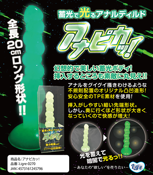 」の登場です!アナルをグイグイとかき分けるような凸凹形状!素材はTPEなので人体にも安心安全です!暗闇でピカッと光るアナルディルド!とっても幻想的で美しい!挿入するところも素敵に丸見え!先端は挿入しやすい作りで、奥に行くほど球が大きくなる!この凸凹形状が最高に気持ち良いのです!さらに200mmのロング形状なので、挿入感も大満足の一品!アナピカッでアナルプレイを楽しもう!