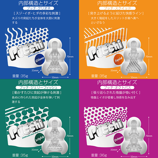 <クリオネ内部構造>「スジ・イボ・ヒダの多彩な刺激」大ぶりの突起たちが全体を大胆に刺激する<ジェリーフィッシュ内部構造>「動かすたびに突起が弾ける刺激」長めに作られた突起が全体を弾いて刺激する<オクトパス内部構造>「張り巡らされた吸盤が吸い付く」吸盤とイボが密着し快感を生み出す<スクイッド内部構造>「突き上げるように延びた快感ライン」大きく隆起をしたスリットが奥へ奥へといざなう