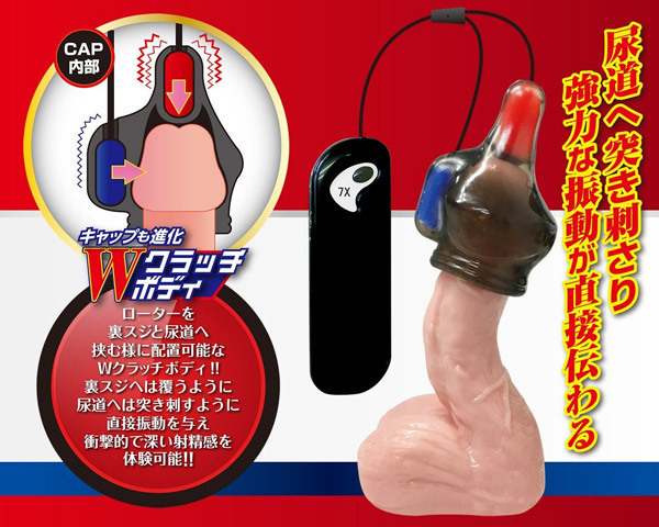 亀頭キャップ自体もローターを裏スジと尿道へ挟むように配置できるWクラッチボディへと進化!裏スジへは覆うように、尿道へは突き刺すように直接振動を与えます。