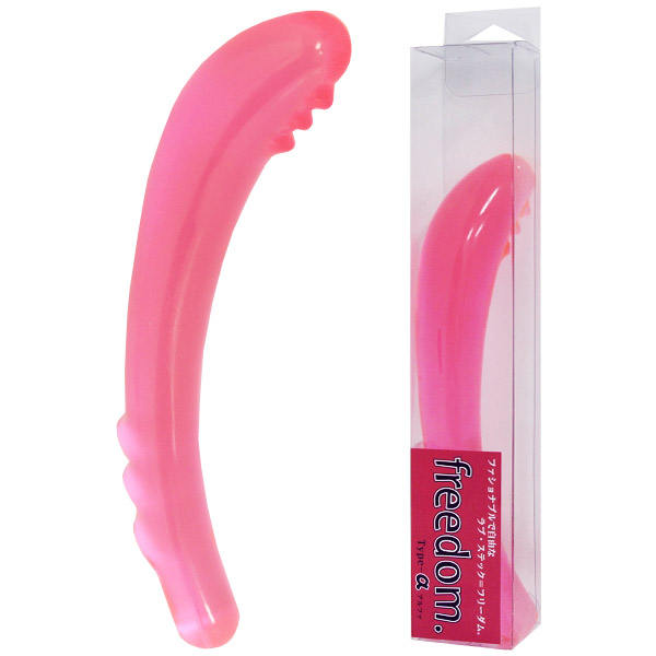 緩やかな曲線を描くクリアピンクの「アルファ(α)」は、太さの違う両端のそれぞれに3段階のイボを配置。