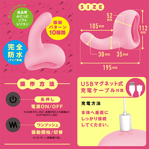 ●本体:充電時間約70分●本体:最大連続稼働時間約80分(初期振動パターン未変更時)●完全防水IPX7等級●10パターン振動●カラー:ピンク