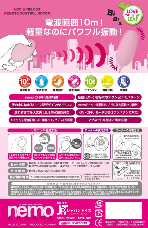 ●前作より軽量化・小型ハイパーモーターを内蔵●送信距離は約10m・パターン10種を1ボタン操作●電池式リモコン:23A12V×1本使用(予備1本付属)●2秒以上の長押しで起動●マグネットUSB充電式ローター:電源入切をライト点灯でお知らせ●2時間でフルチャージ(約2時間使用可能)●生活防水+静音仕様。