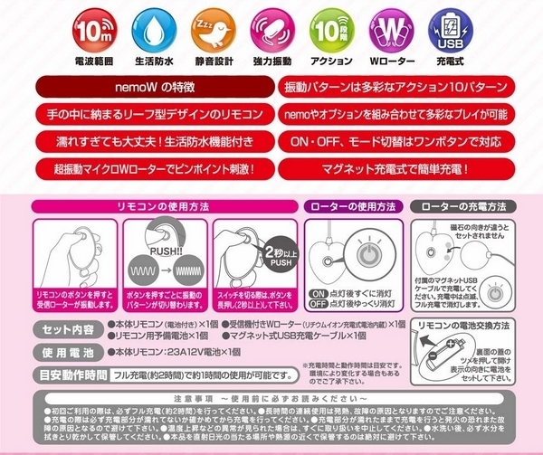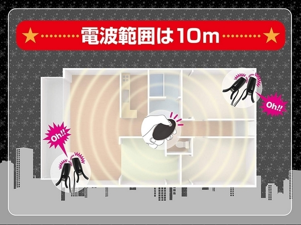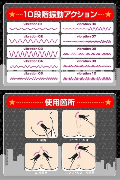 挟み心地は痛すぎず、しかし脱落しづらい力加減で、ローターの震動をしっかり感じていただけます♪震動アクションは豊富な10種類!乳首やクリなど、お好みの箇所に挟んでお楽しみください♪また、遠隔操作にも対応で、送受信距離はおよそ10m。